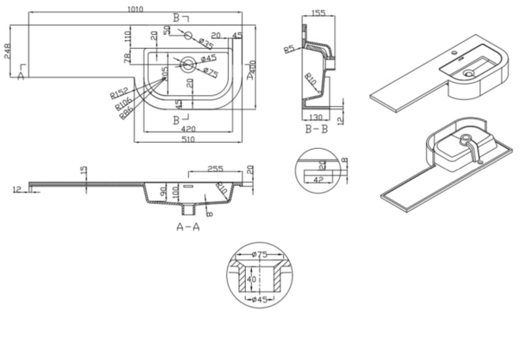 - Left Hand 1TH Wash Basin & Side Shelf (FUS1010LH)