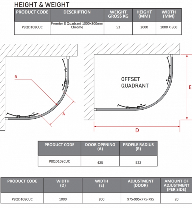 The Impey Coram Premier 8 8mm Plain Glass 1000mm x 800mm Double Offset Quadrant Shower Enclosure Chrome (P8QD108CUC) is a stylish and practical shower enclosure designed to provide a spacious and luxurious shower experience. Part of the Impey Coram Premier 8 range, this double offset quadrant enclosure combines elegant design with high-quality materials to offer a modern, durable, and functional addition to your bathroom.