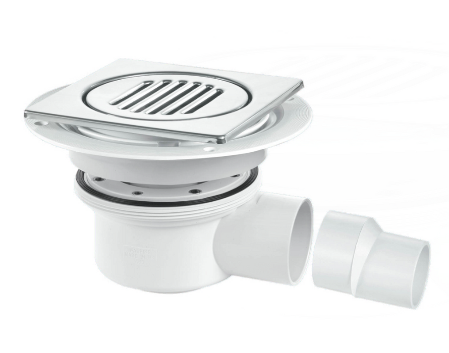 McAlpine TSG52-T150SS 2 Piece 50mm Water Seal Gravity Trapped Gully, Square Chrome Top For Tiled Floor